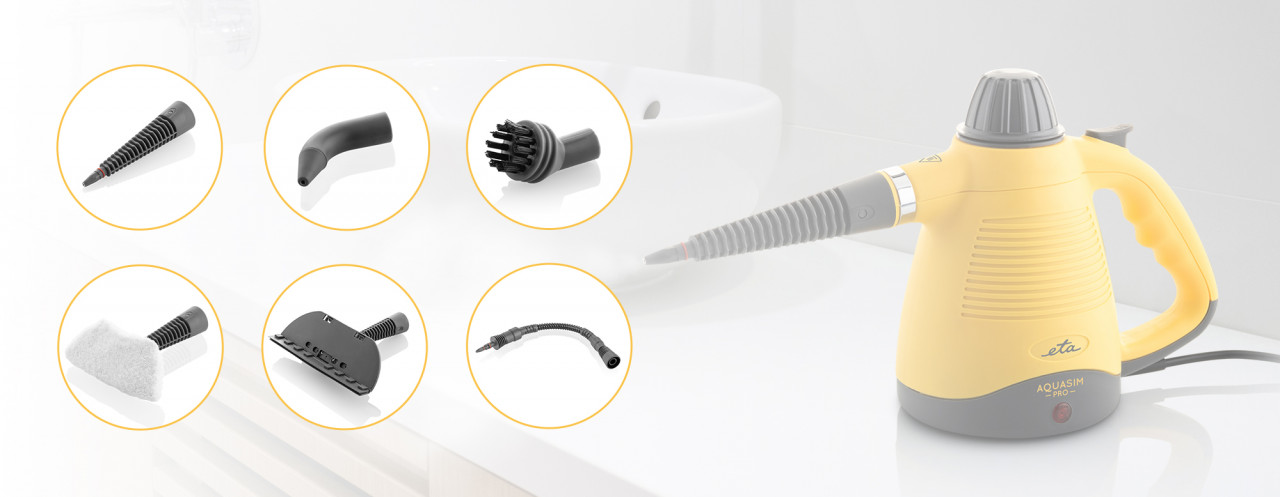 Consum de energie 900 W Presiune de functionare 3.5 bari Volumul rezervorului 250 ml = pana la 10 minute de generare abur Pregatire rapida a aburului: aproximativ 3 minute Cablu de alimentare foarte lung 5 m Semnalizare luminoasa ”gata de lucru” Reglare si control automat al debitului de abur Carcasa izolata termic pentru utilizare in conditii de siguranta Buton de siguranta pentru a preveni activarea neintentionata a aburului Principalele avantaje: – curata usor : cu abur fierbinte fara substante chimice agresive si mirosuri toxice asociate – curata usor : cu abur fierbinte fara substante chimice agresive si mirosuri toxice asociate – ecologic : practic este necesara doar apa pentru curatare – economic : platiti doar electricitatea consumata si apa fara necesitatea de a cumpara agenti de curatare – utilizare multipla : multitudinea de accesorii permite curatarea diferitelor suprafete murdare Pachetul include o gama larga de accesorii cu ajutorul carora veti obtine rezultate perfecte: – Furtun extensibil flexibil – datorita lungimii suficiente si flexibilitatii ridicate, este potrivit pentru curatarea locurilor greu accesibile – Duza conica concentratoare – accesoriu de baza pentru curatarea universala; permite extinderea partiala a domeniului de lucru si serveste, de asemenea, ca adaptor de baza pentru conectarea altor accesorii – Duza curbata – pentru a curata colturile greu accesibile, cum ar fi vasele de toaleta, chiuvete etc. – Perie rotunda – pentru curatarea murdariei din zone mici, cum ar fi rosturrile de la faianta / gresie, plite, jaluzele, etc – Racleta pentru ferestre si suprafete plane – Racleta cu fibra textila – pentru ferestre si suprafete plane in special pentru curatarea ferestrelor, a diferitelor suprafete din sticla si pentru curatarea (calcare usoara) a mobilierului textil, cum ar fi canapele, fotolii, perne sau haine, etc. – Recipient transparent pentru reumplerea apei – Palnie pentru reumplere cu apei O gama larga de accesorii va permite sa curatati bai, chiuvete, toalete, calorifere, gratare, imbinari, ferestre, oglinzi, tapiterie, perti interioare si rotile masinii, etc. Curatare ecologica si economica fara a fi nevoie de substante chimice Delicat cu suprafetele curatate Supapa de siguranta pentru protectie impotriva oparirii Manevrare si inlocuire usoara a accesoriilor Un ajutor profesional pentru o curatare usoara Cu ETA 1265 AQUASIM PRO , curatarea intregii gospodarii devine mai usoara. Cu ajutorul aburului fierbinte, dezinfecteaza foarte eficient diverse suprafete si materiale , indeparteaza murdaria si ajuta la dizolvarea grasimii. Toate acestea fara a fi nevoie de substante chimice. Curatarea este astfel ecologica, economica si delicata cu suprafetele. Cand porniti aparatul, aburul este generat foarte rapid – in doar 3 minute si presiunea de 3,5 bar este controlata automat. Pentru o singura umplere, aburul se formeaza pana la 10 minute, ceea ce presupune o eficienta a curatarii, avand suficient timp pentru a scapa de murdarie, de exemplu in intreaga baie. Utilizarea aburului fierbinte dezinfecteaza foarte eficient diverse suprafete si materiale, indeparteaza murdaria, dizolva grasimea, sterge murdaria, etc