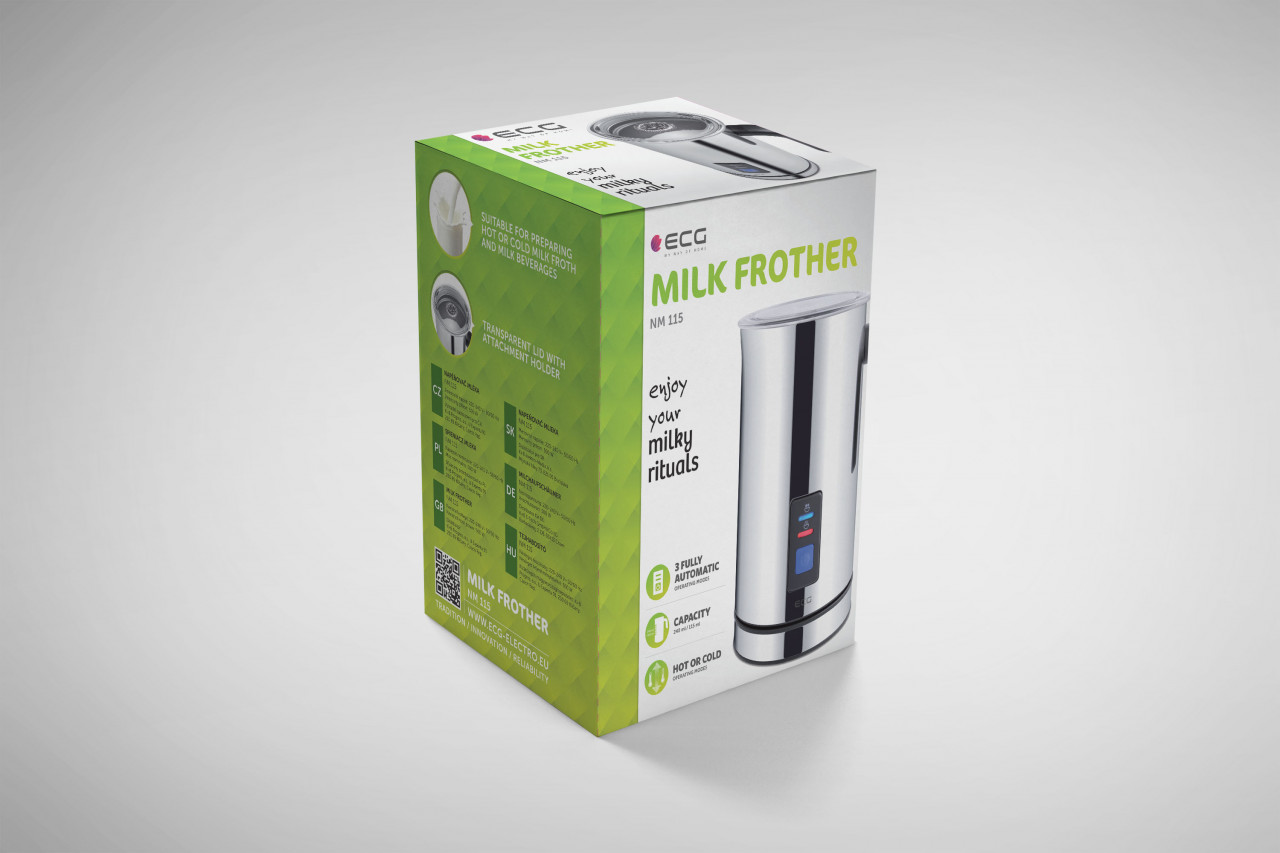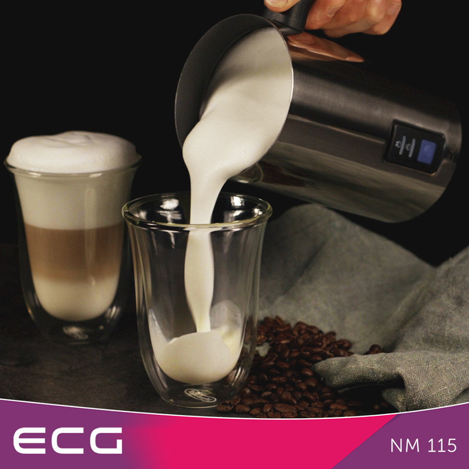 Putere de intrare 500 W Design de lux din otel inoxidabil Functii: – incalzire lapte 240 ml / 80 secunde – spumare lapte cald 115 ml / 80-90 secunde – spumare lapte rece 114 ml / 65 secunde Temperatura maxima a laptelui 65° (± 5°) Functie de oprire automata Pereti dubli cu suprafata neaderenta Capac transparent Cu ECG NM 115 va veti bucura de aroma perfecta a bauturilor preferate, delicatese precum cappuccino, cafea cu lapte sau cafea racoritoare cu gheata. Utilizarea este foarte simpla pentru a pregati o bautura excelenta – umpleti recipientul, inchideti capacul si porrniti aparatul cu o singura atingere. Lapte fierbinte in cateva momente Pentru spuma, puteti umple recipientul cu pana la 115 ml de lapte. Apoi asteptati doar 80 de secunde pana cand se creeaza o spuma perfecta. Recipientul are o suprafata interioara neaderenta si un perete dublu cu functie de izolare termica. Temperatura laptelui nu depaseste niciodata 65 ° C astfel ca nu veti strica gustul bauturii Dvs. preferate cu lapte prea fierbinte. Design deosebit ECG NM 115 se mandreste cu un design de lux din otel inoxidabil, cu accent pe detalii. Una dintre aceste detalii importante este pad-ul anti-alunecare care asigura o pozitionare stabila a aparatului pe blatul de lucru. Daca esti in cautarea unui aparat de calitate pentru spuma de lapte, cu design deosebit si usor de folosit, iti recomandam calduros ECG NM 115.