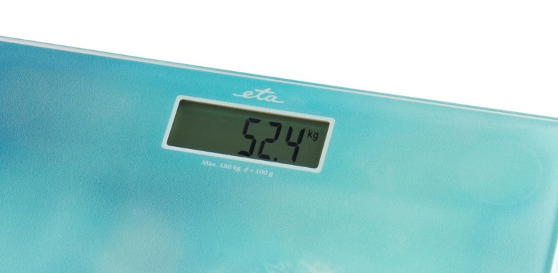 Capacitate maxima de cantarire 180 kg / 397 lb Precizie de cantarire 100 g Suprafata de cantarire din sticla – geam securizat cu o grosime de 6 mm Posibilitate de cantarire in urmatoarele unitati – kg/kilograme, lb/livra (unitate de greutate britanica), st/stone (unitate de greutate americana) Afisaj LCD mare Pornire prin calcare pe suprafata de cantarire Oprire automata pentru economisirea bateriei Resetare automata inainte si dupa cantarire Indicator de suprasarcina, indicator de baterie descarcata Alimentare cu baterie CR2032 (inclusa) Cantarul digital ETA Breeze albastru, cu un design deosebit, va aduce un plus de eleganta si functionalitate pentru baia sau dormitorul dumneavoastra. Pastrarea unei imagini de ansamblu asupra greutatii tale va fi mult mai placuta pentru toti membrii familiei. ETA Breeze cantareste pana la 180 kg cu o precizie de 100 g . Este echipat cu o suprafata de cantarire din sticla securizata foarte rezistenta de 6 mm si permite cantarirea in kilograme, livre si stone.Pur si simplu porniti cantarul calcand pe acesta si datorita afisajului LCD mare puteti citi cu usurinta valoarea masurata. Alte caracteristici: – Sistem de pornire a cantarului AUTO STEP ON – trebuie doar sa pasiti pe cantar si sa ramaneti nemiscat, cantarul se va porni automat si va incepe sa efectueze masuratori – Indicator de suprasarcina, indicator de baterie descarcata – Intretinere usoara si igienica a suprafetei de cantarire