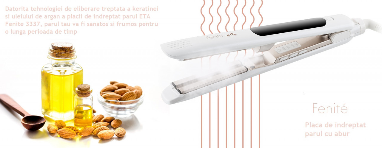 Fie ca ai parul mai scurt sau foarte lung cu ETA FENITE 3337 vei obtine o coafura incantatoare fara a vizita un salon de infrumusetare. Inca de la prima utilizare vei adora aceasta placa in design modern alb perlat care vine la pachet cu o husa practica de calatorie. Folositi abur pentru o coafare eficienta si rapida Datorita tehnologiei de eliberare treptata a keratinei si uleiului de argan, parul tau este protejat de deteriorare de fiecare data cand folosesti dispozitivul. ETA FENITE 3337 are o functie unica de calcare cu abur . Volumul rezervorului de 7,5 ml va ofera pana la 20 de minute de abur. Rezervorul este detasabil pentru umplere usoara. Lumini de semnalizare informeaza de functionarea dispozitivului – cand indicatorul clipeste placile se incalzesc si atunci cand este aprins continuu temperatura setata a fost atinsa. Cablul de alimentare rotativ faciliteaza manevrarea usoara in timpul utilizarii. Bucla de agatare este foarte practica pentru racire sau depozitare, astfel incat aveti intotdeauna apratul la indemana. Pentru o depozitare sigura, puteti bloca placile in pozitia inchisa. Manevrare usoara cu rezultate perfecte Incalzirea rapida a placilor va permite sa incepeti coafarea parului aproape imediat. Suprafata din ceramica-turmalina a placilor de 25 x 90,5 mm este foarte blanda cu parul si adera perfect la acesta. In intervalul de temperatura de la 160 la 220 ° C se pot indrepta toate tipurile de par. Lungimea cablului de alimentare rotativ de 1,7 m va permite o manevrare usoara. Pentru o depozitare mai usoara, este utila optiunea de blocare a placilor in pozitia inchisa. Deseori uiti sa deconectati aparatul de indreptat parul si sa pleci din casa ? ETA FENITE este echipat cu o functie de siguranta care opreste automat aparatul 30 de minute de inactivitate,. Desigur este echipat si cu o protectie impotriva supraincalzirii. Totul pentru linistea si siguranta ta Sistemul PTC incalzeste placile in cateva momente si mentine automat temperatura constanta. Placile cu suprafata ceramica adera perfect la par astfel incat sa indrepte suvitele rapid si eficient. Functionarea este semnalizata luminos de un afisaj LED clar. – Operare simpla si intretinere usoara – Comutator PORNIT / OPRIT – Cablu de alimentare pivotant – Bucla de agatare – Incalzire rapida a placilor – Protectie la supraincalzire – Posibilitatea de blocare a placilor in pozitie inchisa – Afisaj LED clar – Functie de siguranta pentru oprire automata dupa 30 de minute – Semnalizarea luminoasa de functionare si de atingere a temperaturii – Forma si design practice – Rezervor de apa detasabil pentru umplere usoara – Poate fi folosit impreuna cu o lotiune de par pentru a imbunatati calitatea parului si rezultatele coafurii – Lungimea cablului de alimentare 1,7 m Intervale de temperatura in functie de tipul de par – Temperatura scazuta (160 – 180 °C) – pentru parul fin, decolorat sau deteriorat – Temperatura medie (180 – 200 °C) – pentru par normal si ondulat – Temperatura ridicata (200 – 220 °C) – pentru par puternic, aspru si cret