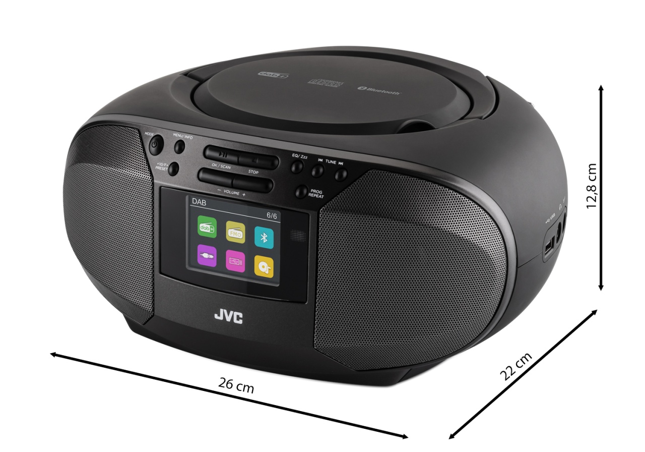Radio portabil cu redare CD si fisiere MP3 Putere de iesire 2 × 2,5 W Tuner DAB+ / FM cu posibilitatea de a salva pana la 40 de posturi DAB+ si 40 de posturi FM Tehnologie Bluetooth pentru redarea muzicii de pe dispozitive mobile Ecran LCD color clar pentru setari usoare Telecomanda pentru confort maxim Equalizatoare presetate pentru ajustarea sunetului dupa preferinte Consum de energie 18 W Consum de energie in modul Standby Temperatura de lucru +5 °C – +35 °C Gama de frecvente DAB 174.928 – 239.200 MHz Gama de frecvente FM 87,5 – 108 MHz Numarul de posturi presetate DAB / FM 40 / 40 Bluetooth V5.3+EDR, compatibilitate cu profilul A2DP Gama de frecvente BT 2.402 – 2.480 MHz EIRP (puterea maxima de transmisie) 4,44 dBm Alimentare – 100 – 240 V c.a. ~ 60 / 50 Hz – 6 × baterii LR14/C (1,5 V) Dimensiuni 26.0 cm (latime) × 22.0 cm (grosime) × 12.8 cm (inaltime) Greutate aprox. 1,2 kg Continutul pachetului :: CD player portabil JVC RD-E664B-DAB, Cablu de alimentare, Telecomanda + 2 × baterii AAA de 1.5 V, Manual de utilizare in limba romana Universul muzicii la tine acasa Ai inca hiturile tale preferate mai vechi pe CD-uri ? Cu radioul JVC RD-E664B-DAB le poti asculta oricand si iti poti aminti nostalgic de vremurile trecute. Playerul ofera insa si modalitati moderne de redare a muzicii. Datorita tehnologiei Bluetooth , poti reda muzica preferata direct de pe telefonul tau. Aparatul este echipat cu tuner FM si DAB+ , astfel iti poti seta posturile preferate in cea mai buna calitate. Te va bucura si afisajul orei si functia de alarma cu posibilitatea de amanare a trezirii. Ecranul LCD color face setarile playerului foarte simple si intuitive. Pentru si mai mult confort, in pachet este inclus si o telecomanda . Radioul poate fi alimentat de la retea sau cu ajutorul a 6 baterii de tip C (nu sunt incluse). Ecran LCD color pentru control usor Ecranul LCD color al radioului JVC usureaza si face mai placuta utilizarea. Datorita interfetei intuitive si afisajului clar, navigarea prin meniu este fluida si fara probleme. Equalizatoare presetate pentru un sunet perfect Pentru ajustarea fina a sunetului exact dupa preferintele tale, poti folosi 6 egalizatoare presetate (Normal, Classic, Jazz, Pop, Rock, Stiri) si 1 egalizator personalizat. Doua difuzoare incorporate, cu o putere totala de 5 W asigura un sunet suficient de puternic pentru o camera medie. Optiuni moderne si clasice de ascultare a muzicii Radioul JVC poate reda CD , CD-R si CD-RW (cu citire MP3). Poti folosi si intrarea USB pentru a asculta fisiere MP3 de pe un stick USB (pana la 32 GB). Sau poti conecta telefonul, tableta ori MP3 playerul prin Bluetooth sau cablul AUX de 3,5 mm. Muzica poate fi ascultata si la casti, pentru momentele in care vrei intimitate.