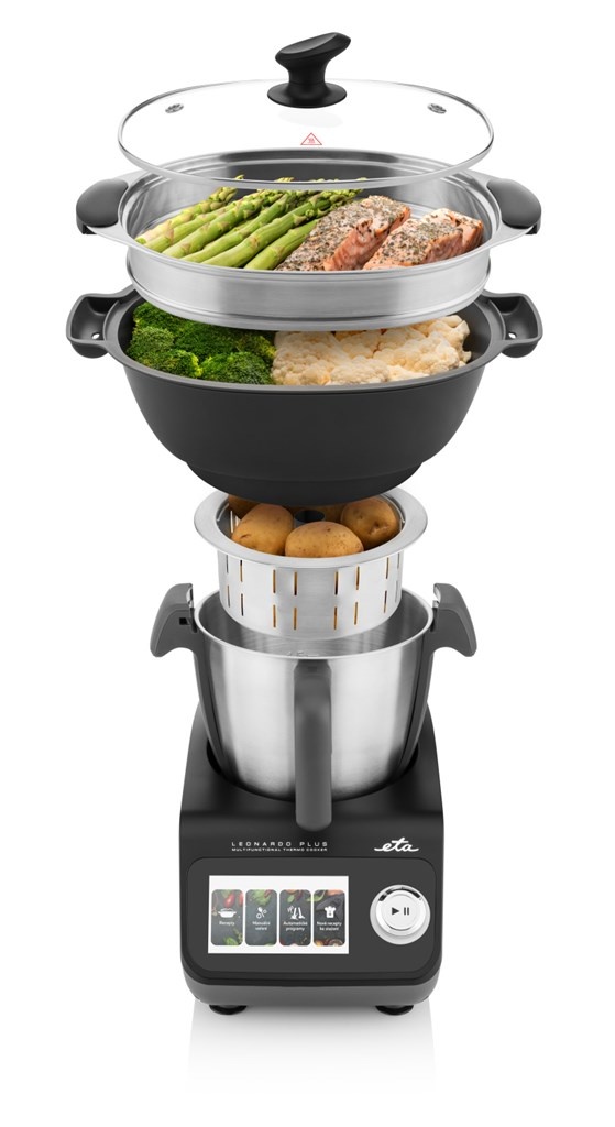 Tip produs: robot de gatit multifunctional 15 functii Afisaj LCD tactil iluminat Comanda electronica Ecran tactil 7 programe presetate Baza de date cu retete Actualizare retete: prin Wi-Fi Cantar integrat Utilizare: alimente reci si calde Reglaj turatie: continuu, 125–5000 rotatii/minut + functie PULSE Functie REVERS Functie incalzire: 37–130 °C Putere incalzire: 1000 W Putere motor: 600 W Capacitate vas: 3,5 litri Material: inox si plastic de calitate Capac detasabil cu orificiu pentru adaugarea ingredientelor Cos din inox Recipient de gatire la abur prevazut cu capac din sticla Siguranta: – protectie la asamblare incorecta – protectie la pornire in lipsa vasului – protectie la supraincalzire Stabilitate : picioare cu ventuze Curatare : componentele (exceptand baza cu motor) pot fi spalate in masina de spalat vase Accesorii compatibile cu masina de spalat vase (cu eliberarea axului inainte de spalare) Accesorii incluse: Vas de lucru 3,5 litri Cutite de mixare din inox Vas de gatire din inox Vas de gatire la abur prevazut cu capac din sticla 3 discuri de razuire/feliere Carlig pentru framantare Tel pentru mixare Spatula din silicon Manual de instructiuni in limba romana, retetar inclus in memoria aparatului in limba ceha si limba germana. Robotul multifunctional ETA Leonardo Plus se prezinta intr-o versiune eleganta, de culoare neagra, cu accesorii noi si functionalitate extinsa. Este solutia ideala atat pentru pasionatii de gatit, cat si pentru cei care doresc rezultate rapide si eficiente. Un singur aparat inlocuieste mai multe electrocasnice si va permite sa pregatiti chiar si un meniu complet de pranz. ETA Leonardo Plus combina functiile de mixer , blender , aparat de gatit cu abur si cantar de bucatarie , economisind timp si spatiu. Datorita memoriei cu retete presetate, robotul va ghideaza pas cu pas pe tot parcursul procesului de gatire, fiind potrivit inclusiv pentru incepatori. Controlul se realizeaza simplu si intuitiv prin intermediul ecranului tactil LCD iluminat . Puteti alege o reteta din baza de date sau puteti gati manual, ajustand temperatura, timpul si viteza de amestecare in functie de preferinte. Robotul permite prepararea usoara a retetelor traditionale, dar si a celor din bucataria internationala, inclusiv franceza si asiatica. Conectarea la reteaua Wi-Fi permite actualizarea periodica a retetelor realizate de bucatari cehi experimentati. Retetele pot fi cautate alfabetic, dupa tipul de preparat sau dupa ingrediente si pot fi salvate in lista de favorite. Accesoriile bogate transforma ETA Leonardo Plus intr-un ajutor complet in bucatarie: vasul de gatire cu maner practic, carligul pentru framantare, telul pentru spumare, cutitele din inox pentru mixare si tocare, cosul de gatire si recipientul de gatire la abur pentru preparate sanatoase, precum si accesoriile pentru razuire si feliere. Curatarea si intretinerea sunt la fel de simple ca utilizarea. Toate componentele, cu exceptia bazei cu motor, pot fi spalate in masina de spalat vase, inclusiv vasul de gatire (cu eliberarea prealabila a axului). ETA Leonardo Plus este un robot de gatit complet, modern si inteligent conceput pentru a simplifica gatitul zilnic. Cu functii avansate, control intuitiv, retete actualizabile si accesorii extinse, acest aparat ofera flexibilitate maxima, rezultate constante si economie reala de timp si spatiu in bucatarie. Este ideal pentru familii, pasionatii de gatit si utilizatorii care apreciaza confortul si performanta intr-un singur dispozitiv.