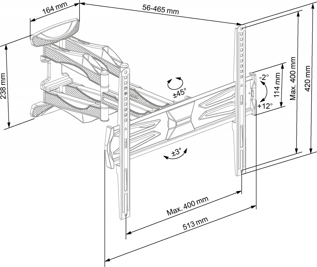 Suport TV de perete ECG LD 326001, 32″- 60″ (81 – 152 cm), rotire 180° si inclinare 2°-12°, 30 kg, VESA